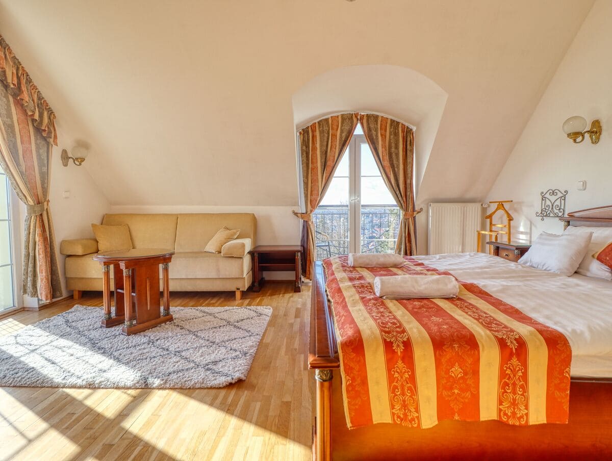 Nagy méretű pezsgőfürdőkádas szobáink tökéletesek gyermekkel érkező családoknak. 35nm-es szobáinkat elegáns, klasszikus stílusban rendeztük be. A pezsgőkád kényelmes lazításra csábít a nap végén. Ezekből a szobáinkból Eger csodálatos panorámájában gyönyörködhet
